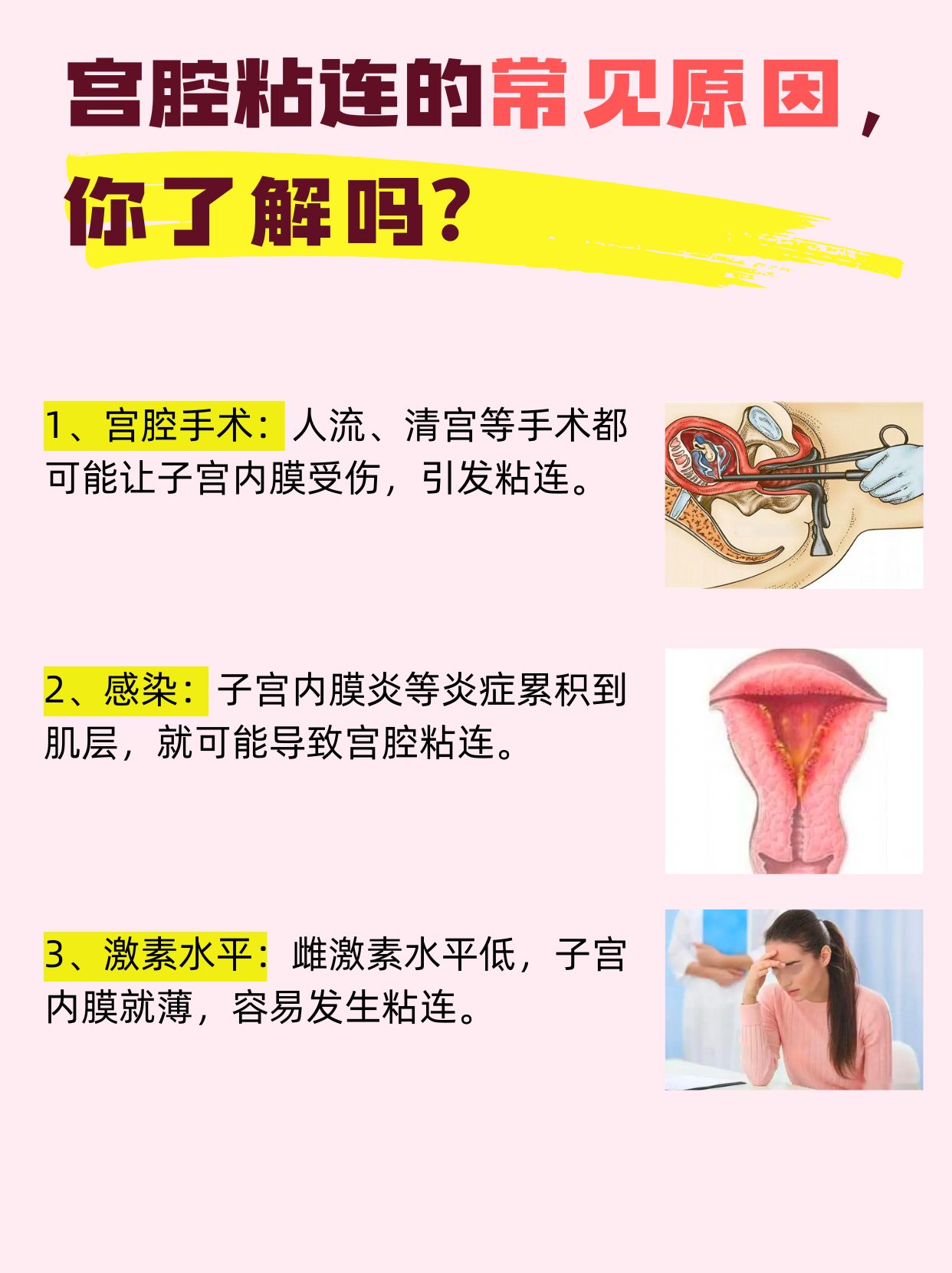2、注意腹痛癥狀:觀察是否出現(xiàn)經(jīng)期腹痛、腰部酸痛等癥狀,如有此類癥狀,應(yīng)考慮可能與宮腔粘連有關(guān)。