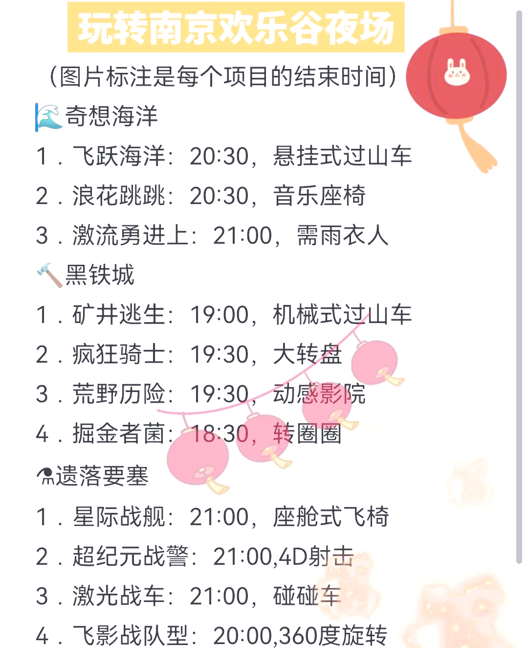 1、合理安排時(shí)間:為了充分體驗(yàn)?zāi)暇g樂(lè)谷的各項(xiàng)設(shè)施和活動(dòng),建議游客安排一天的時(shí)間進(jìn)行游玩。
