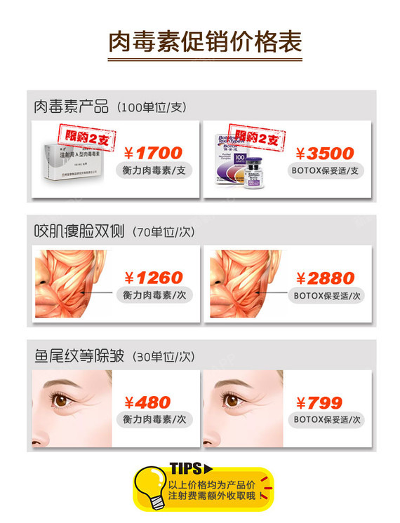 4、個人需求:每個人的面部皺紋情況不同,所需肉毒素的劑量和療程也不同,因此價格也會有所差異。
